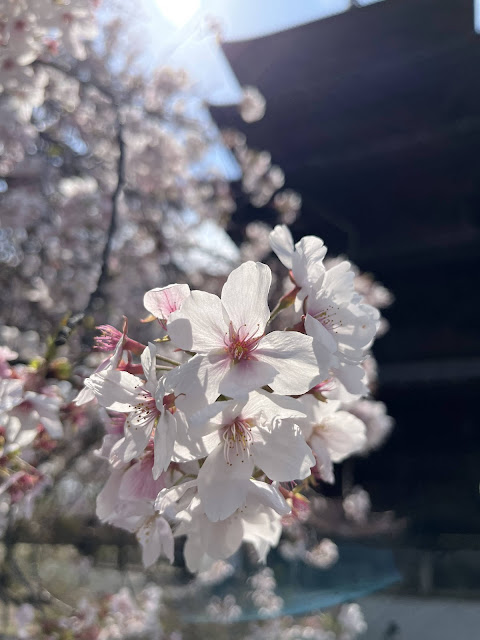 十二年前我來過東寺,記憶中古寺中盛開的櫻花很美,今天我突然發現記憶有誤,當時其實大概百分之四十到六十的盛況而已。這次來到東寺,正是剛過最盛之後的狀態,風一吹起,漫天的櫻花瓣像雪花一樣飄散。等到風停了下來後,落英繽紛。